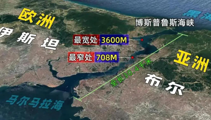 土耳其海峡,主要由三部分组成,分别是博斯普鲁斯海峡、马尔马拉海、达达尼尔海峡。其中博斯普鲁斯海峡,就位于土耳其最大的城市伊斯坦布尔,它将这座城市一分为二,左侧位于欧洲,右侧位于亚洲。因此该海峡又被称之为伊斯坦布尔海峡。